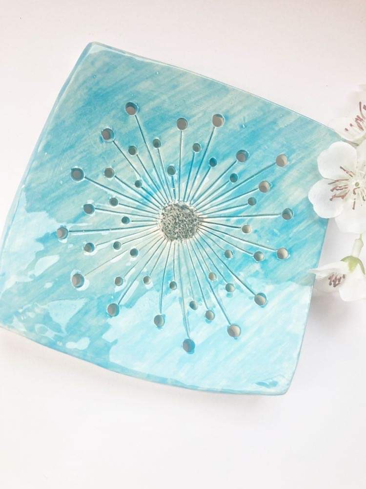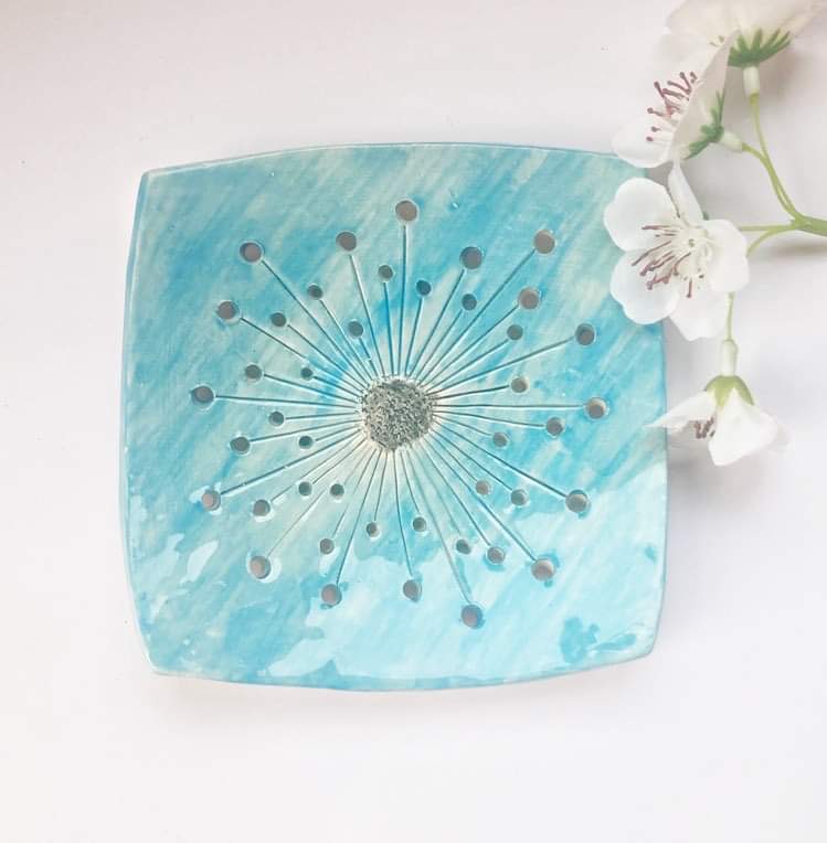 Porte-savon pissenlit en poterie fait main avec des motifs de pissenlit. Peint à la main avec de couleur bleu.
